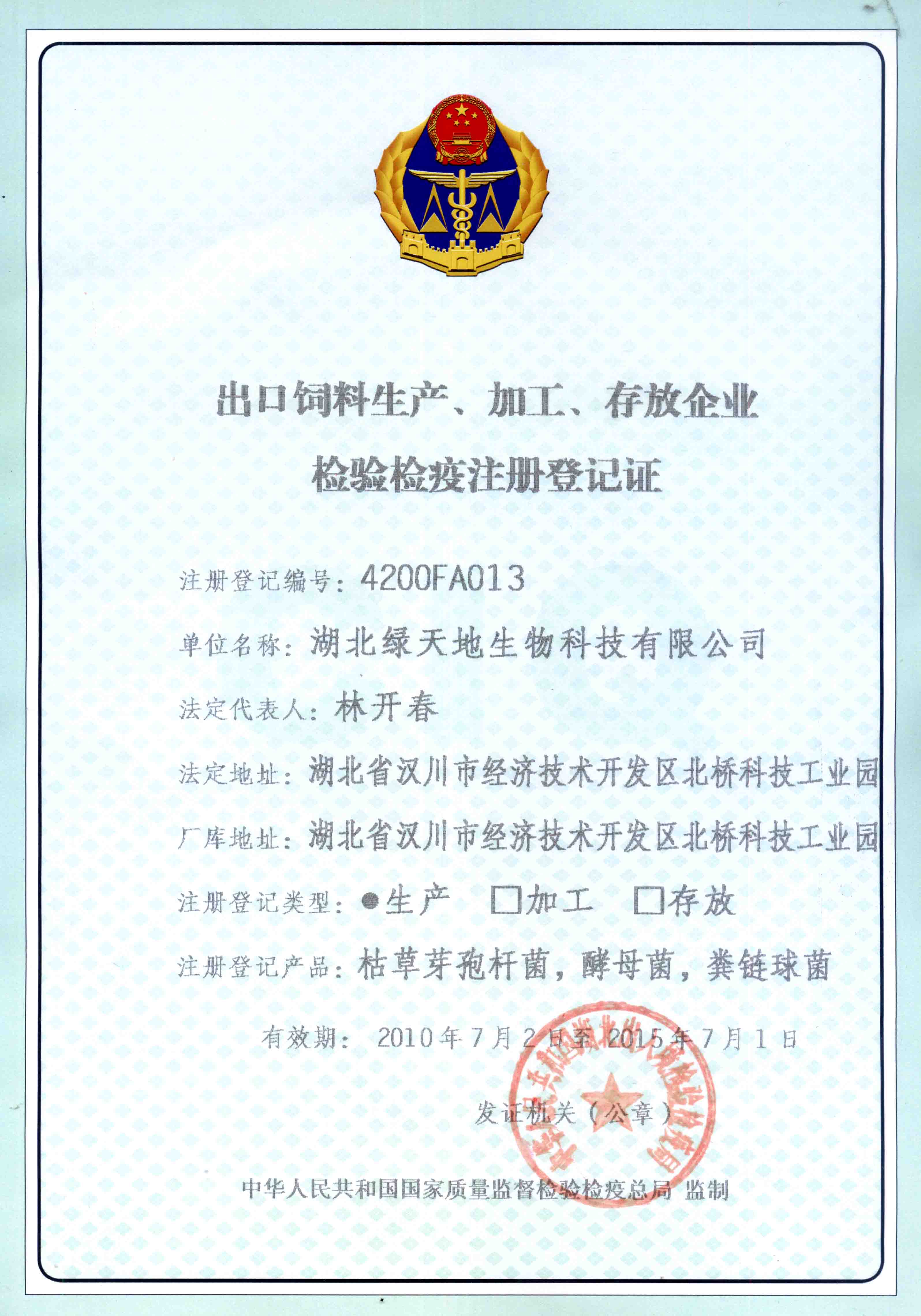 出口飼料生產(chǎn)、加工、存放企業(yè)檢驗(yàn)檢疫注冊(cè)登記證